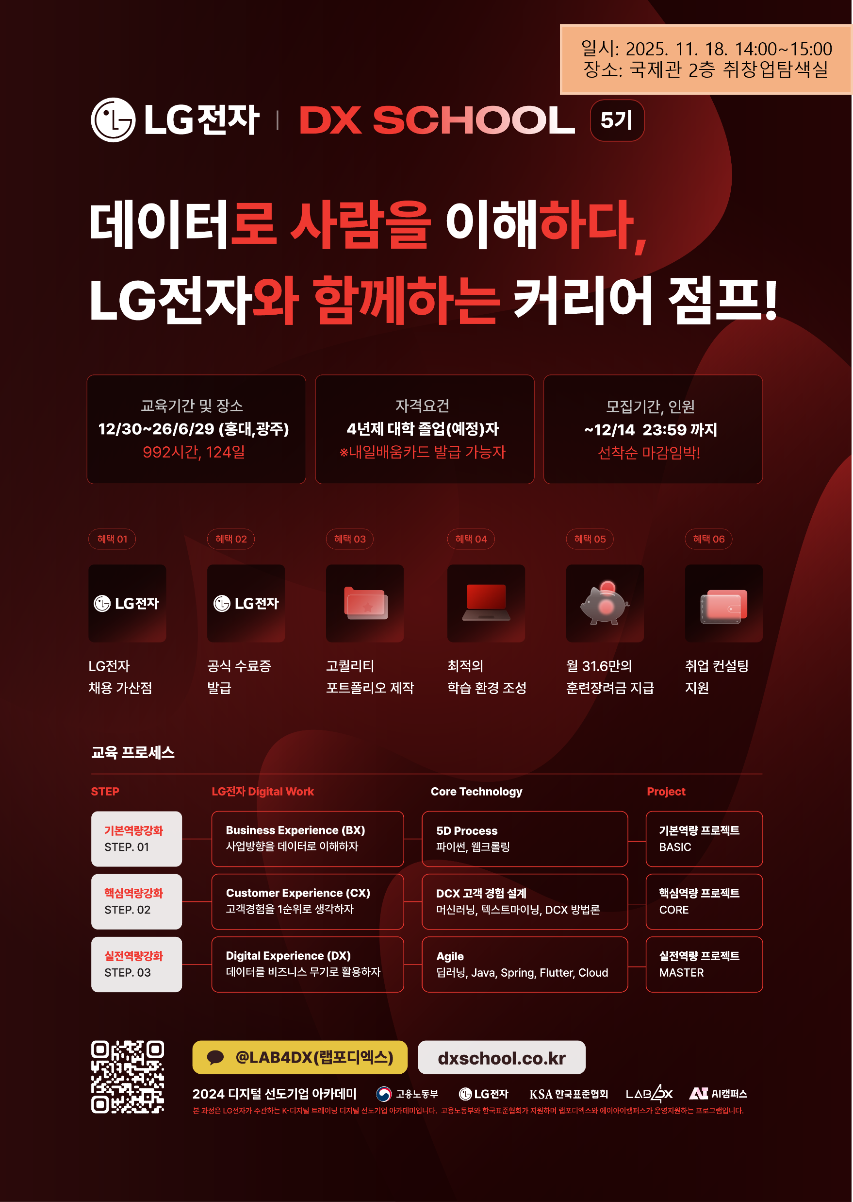 대학혁신지원사업의 일환으로 LG전자 DX School 5기 모집 설명회를 실시합니다.