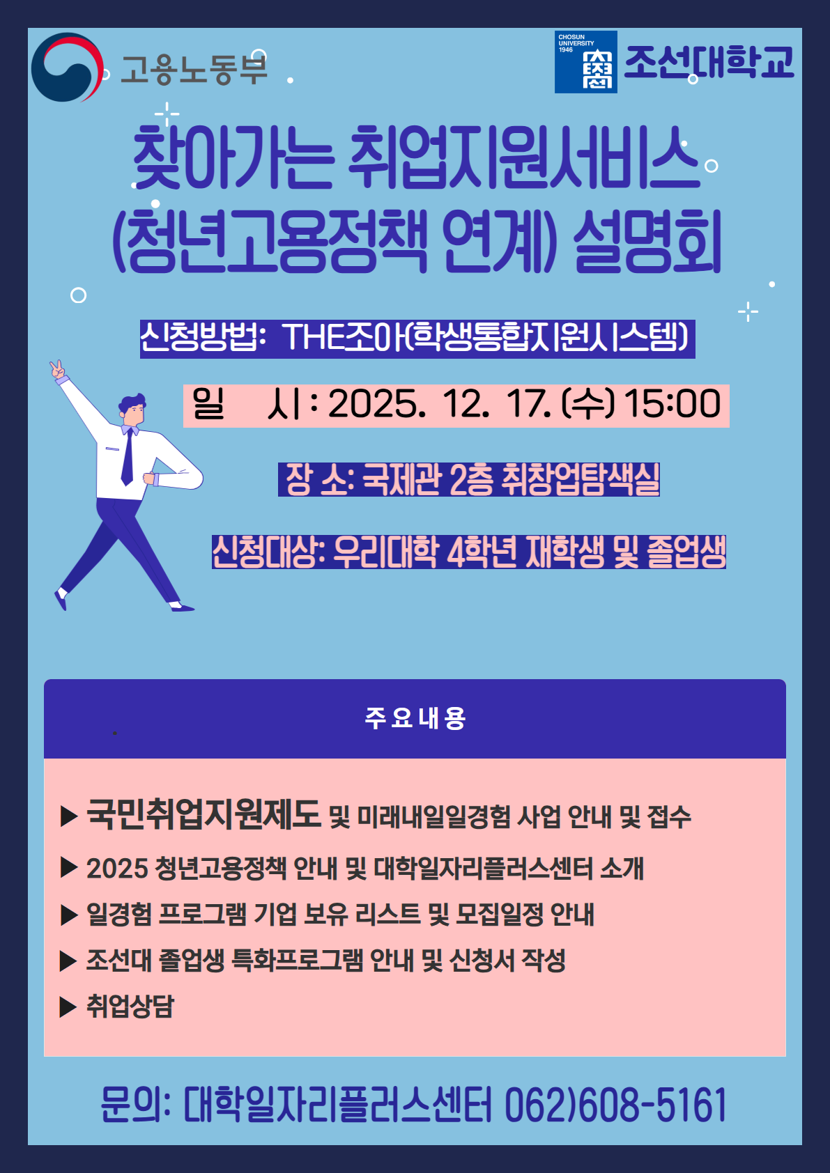<프로그램 개요> 가. 대 상: 우리 대학 4학년 재학생 및 졸업생 ※ 혜택: 간식 제공 등 나. 일 시: 2025. 12. 17.(수) 15:00~17:00 다. 장 소: 조선대학교 국제관 2층 취창업 탐색실 라. 내 용 - 국민취업지원제도 및 일경험 사업 안내 및 접수, 광주청년일자리스테이션(상무)프로그램, 취업상담 - 2025년 청년고용정책 및 대학일자리플러스센터 소개 - 일경험 프로그램 사업체 현황 및 모집일정 안내 - 조선대 졸업생 특화프로그램 안내 및 신청서 작성 마. 참가방법: 학생통합지원시스템(THE조아)에서 신청
