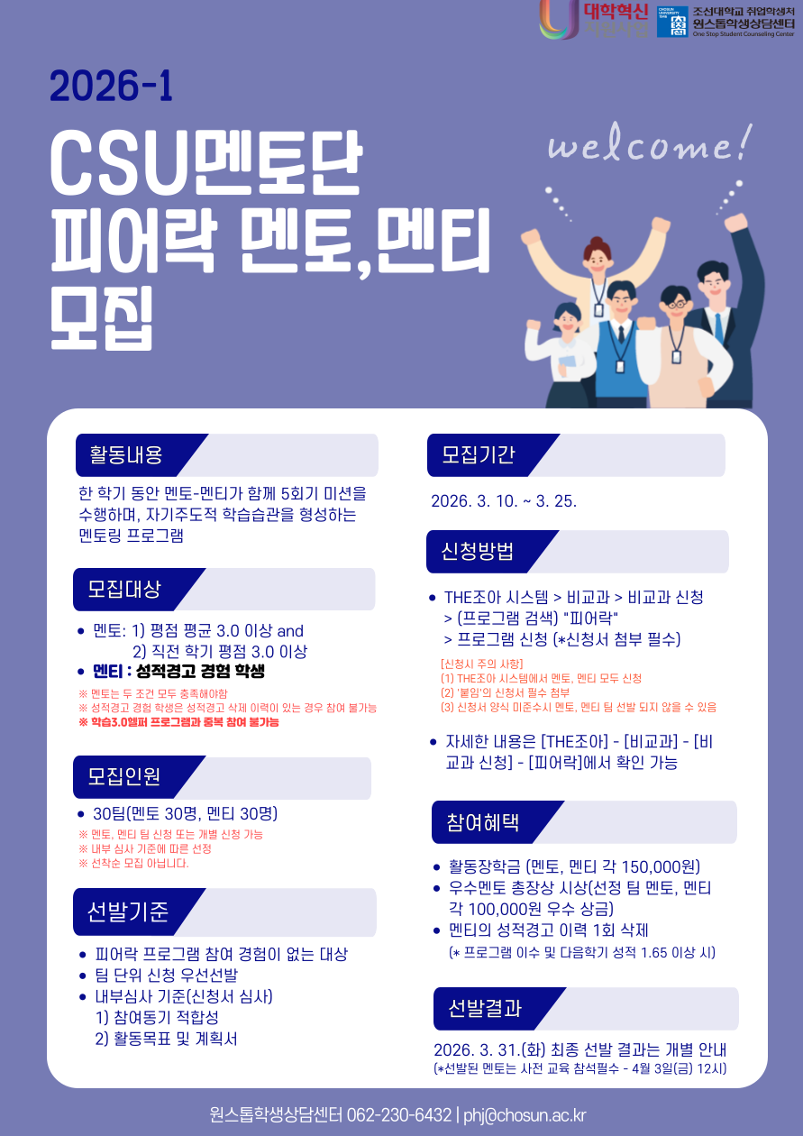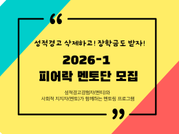 ※ 모집은 선발 기준에 따라 내부심사를 통해 선정 됩니다.(선착순 모집 X) ※ 피어락, 학습3.0헬퍼 프로그램 동시 참여 불가 합니다. (멘토,멘티 모두 해당) ※ 성적경고 1회 삭제는 1번만 가능합니다. 성적경고 삭제 이력이 있는 경우 프로그램 이수를 하더라도, 성적경고 삭제가 불가합니다. ※ 파일양식, 파일제목 등 제출양식에 대한 오류로 신청서 누락 되는 경우 신청이 정상적으로 되지 않습니다. |