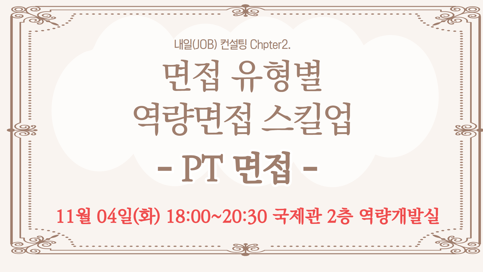 PT면접? 준비한 자만이 웃는다!╰(*°▽°*)╯ PT면접 11. 04.(화) 18:00~20:30 대면(국제관 2층역량개발실)<전자기기 지참> - PT면접의 이해와 구조 설계 - 제시문 분석 및 논리 구조를 통한 PT면접 공략법 (실제 실습 진행: A4 제시문 1개 배포→ 제한시간 5분→ 핵심키워드 찾기) (스크립트 사전 준비자 피드백 가능)←문의 번호로 전화부탁드립니다