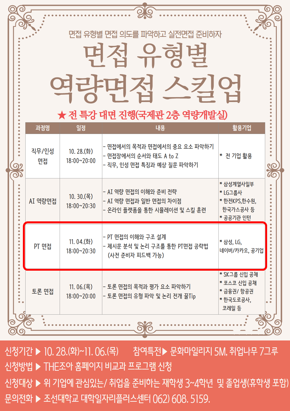 AI역량면접 10. 30.(목) 18:00~20:30 대면(국제관 2층역량개발실) - AI 역량 면접의 이해와 준비 전략 - AI 역량 면접과 일반 면접의 차이점 - 온라인 플랫폼을 통한 시뮬레이션 및 스킬 훈련