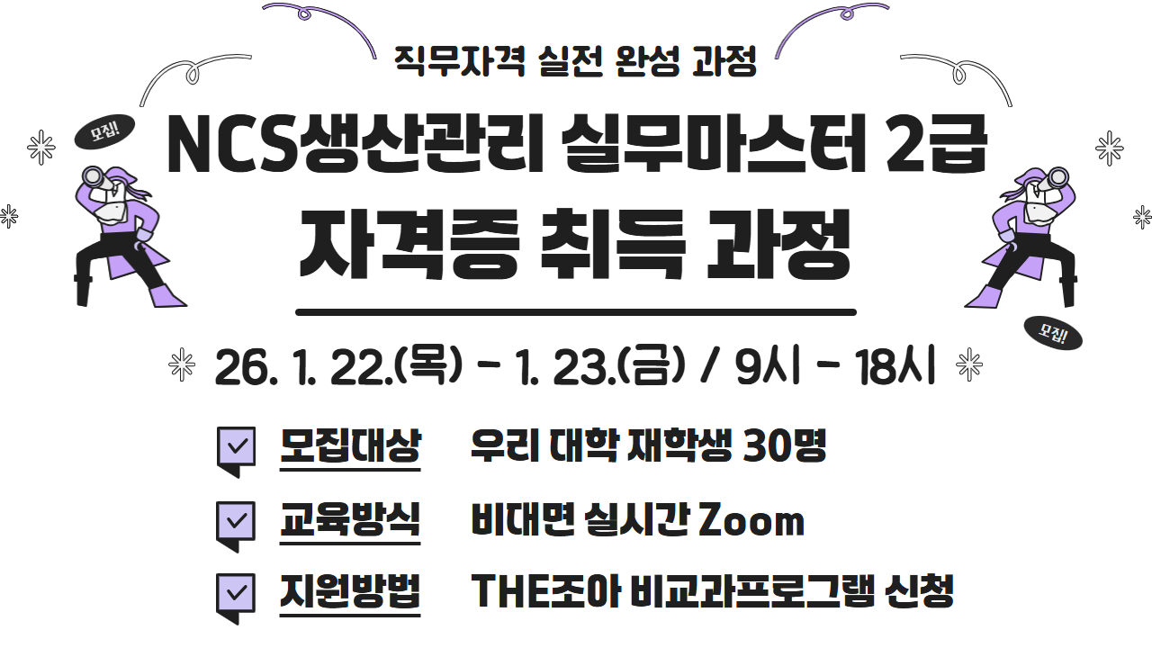 - 교육내용: 생산관리 핵심 이론과 NCS기반 실무 교육을 통한 자격증 취득