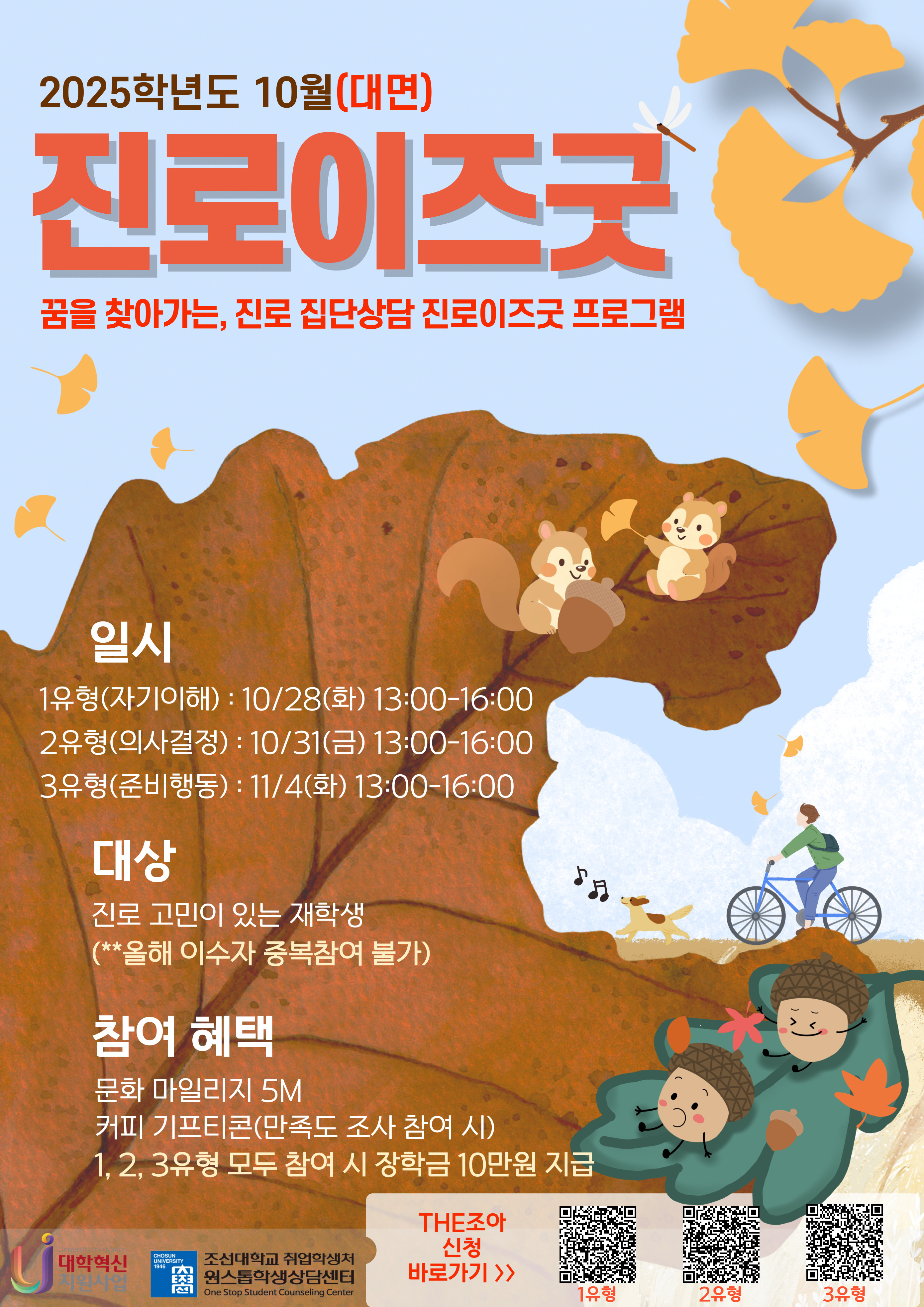 * 진로이즈굿 프로그램은? : 진로 미결정 혹은 진로 결정에 어려움을 느끼는 재학생 대상으로 원스톱학생상담센터에서 진행하는 진로 집단상담 프로그램입니다. 1. 대상 : 진로 준비행동 강화 및 촉진을 하고 싶은 재학생! (나는 진로 결정은 했는데, 왜 준비하지 못하는가...) 2. 프로그램 운영일시 : 2025. 11. 4. (화) 13:00 - 16:00 3. 모집인원 : 21명 (선착순) ** 2025학년도 이수자 재신청 불가 ** 4. 활동내용: GAP분석을 통한 현재와 미래 상황 간 차이 점검, 변화 실행 점검 및 결심 서약서 작성 5. 참여 혜택 : 문화마일리지 5M, 간식, 커피 기프티콘(만족도 참여 보상), 진로이즈굿 3개 유형 모두 참여 시, 장학금 10만원