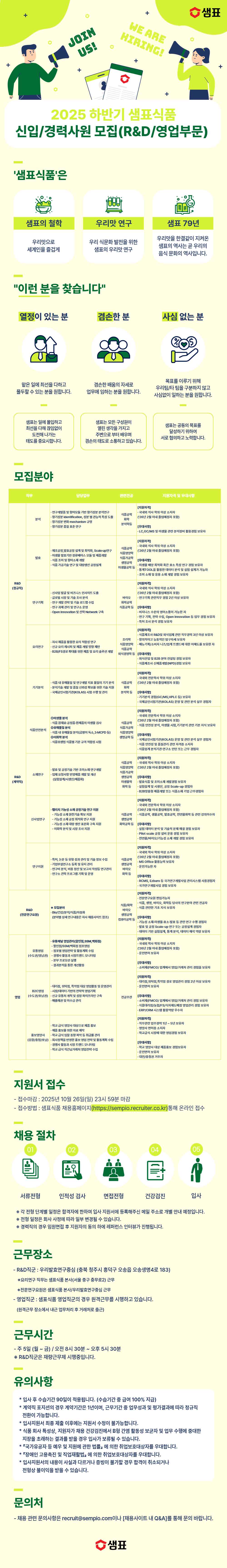 [샘표식품] 2025 하반기 신입/경력사원 모집(R&D/영업부문) 채용공고