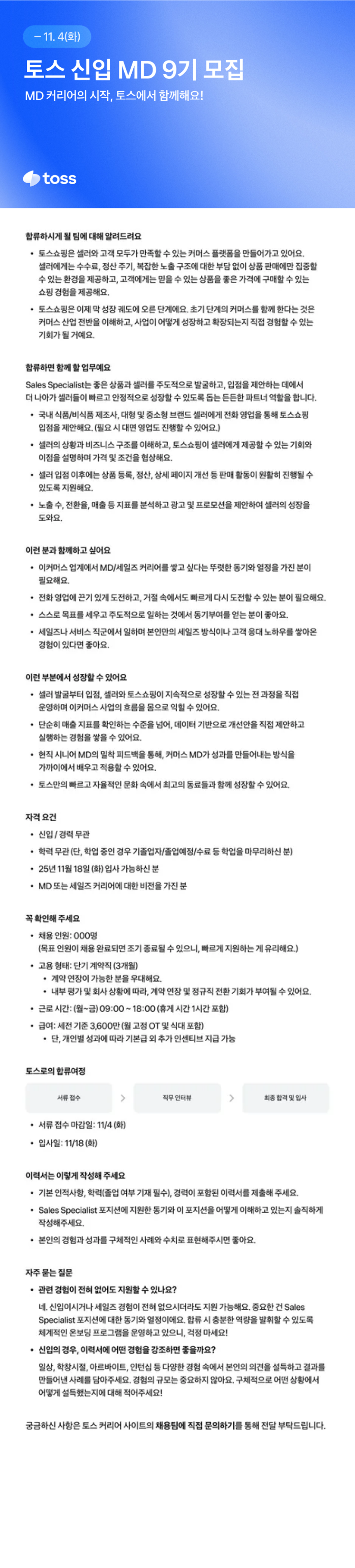 🚀 토스쇼핑 신입 MD 9기 모집 🚀 📌 합류하시게 될 팀에 대해 알려드려요 - 토스쇼핑은 셀러와 고객 모두가 만족할 수 있는 커머스 플랫폼을 만들어가고 있어요. 셀러에게는 수수료, 정산 주기, 복잡한 노출 구조에 대한 부담 없이 상품 판매에만 집중할 수 있는 환경을 제공하고, 고객에게는 믿을 수 있는 상품을 좋은 가격에 구매할 수 있는 쇼핑 경험을 제공해요. - 토스쇼핑은 이제 막 성장 궤도에 오른 단계에요. 초기 단계의 커머스를 함께 한다는 것은 커머스 산업 전반을 이해하고, 사업이 어떻게 성장하고 확장되는지 직접 경험할 수 있는 기회가 될 거예요. 📌 합류하면 함께 할 업무예요 Sales Specialist는 좋은 상품과 셀러를 주도적으로 발굴하고, 입점을 제안하는 데에서 더 나아가 셀러들이 빠르고 안정적으로 성장할 수 있도록 돕는 든든한 파트너 역할을 합니다. - 국내 식품/비식품 제조사, 대형 및 중소형 브랜드 셀러에게 전화 영업을 통해 토스쇼핑 입점을 제안해요.(필요 시 대면 영업도 진행할 수 있어요.) - 셀러의 상황과 비즈니스 구조를 이해하고, 토스쇼핑이 셀러에게 제공할 수 있는 기회와 이점을 설명하며 가격 및 조건을 협상해요. - 셀러 입점 이후에는 상품 등록, 정산, 상세 페이지 개선 등 판매 활동이 원활히 진행될 수 있도록 지원해요. - 노출 수, 전환율, 매출 등 지표를 분석하고 광고 및 프로모션을 제안하여 셀러의 성장을 도와요. 📌 이런 분과 함께하고 싶어요 - 이커머스 업계에서 MD/세일즈 커리어를 쌓고 싶다는 뚜렷한 동기와 열정을 가진 분이 필요해요. - 전화 영업에 끈기 있게 도전하고, 거절 속에서도 빠르게 다시 도전할 수 있는 분이 필요해요. - 스스로 목표를 세우고 주도적으로 일하는 것에서 동기부여를 얻는 분이 좋아요. - 세일즈나 서비스 직군에서 일하며 본인만의 세일즈 방식이나 고객 응대 노하우를 쌓아온 경험이 있다면 좋아요. 📌 이런 부분에서 성장할 수 있어요 - 셀러 발굴부터 입점, 셀러와 토스쇼핑이 지속적으로 성장할 수 있는 전 과정을 직접 운영하며 이커머스 사업의 흐름을 몸으로 익힐 수 있어요. - 단순히 매출 지표를 확인하는 수준을 넘어, 데이터 기반으로 개선안을 직접 제안하고 실행하는 경험을 쌓을 수 있어요. - 현직 시니어 MD의 밀착 피드백을 통해, 커머스 MD가 성과를 만들어내는 방식을 가까이에서 배우고 적용할 수 있어요. - 토스만의 빠르고 자율적인 문화 속에서 최고의 동료들과 함께 성장할 수 있어요. 📌 자격 요건 - 신입/경력 무관 - 학력 무관(단, 학업 중인 경우 기졸업자/졸업예정/수료 등 학업을 마무리하신 분) - 25년 11월 18일(화) 입사 가능하신 분 - MD 또는 세일즈 커리어에 대한 비전을 가진 분 📌 꼭 확인해 주세요 - 채용 인원: 000명 (목표 인원이 채용 완료되면 조기 종료될 수 있으니, 빠르게 지원하는 게 유리해요.) - 고용 형태: 단기 계약직(3개월) - 계약 연장이 가능한 분을 우대해요. - 내부 평가 및 회사 상황에 따라, 계약 연장 및 정규직 전환 기회가 부여될 수 있어요. - 근로 시간 : (월~금) 09:00 ~ 18:00 (휴게시간 1시간 포함) - 급여: 세전 기준 3,600만(월 고정 OT 및 식대 포함) - 단, 개인별 성과에 따라 기본급 외 추가 인센티브 지급 가능 📌 토스로의 합류여정 서류 접수 > 직무 인터뷰 > 최종 합격 및 입사 - 서류 접수 마감일: 11/4(화) - 입사일: 11/18(화) 📌 이력서는 이렇게 작성해 주세요 - 기본 인적사항, 학력(졸업 여부 기재 필수), 경력이 포함된 이력서, 자기소개서를 제출해 주세요. - Sales Specialist 포지션에 지원한 동기와 이 포지션을 어떻게 이해하고 있는지 솔직하게 작성해 주세요. - 본인의 경험과 성과를 구체적인 사례와 수치로 표현해 주시면 좋아요. 📌 자주 묻는 질문 - 관련 경험이 전혀 없어도 지원할 수 있나요? 네. 신입이시거나 세일즈 경험이 전혀 없으시더라도 지원 가능해요. 중요한 건 Sales Specialist 포지션에 대한 동기와 열정이에요. 합류 시 충분한 역량을 발휘할 수 있도록 체계적인 온보딩 프로그램을 운영하고 있으니, 걱정 마세요! - 신입의 경우, 이력서에 어떤 경험을 강조하면 좋을까요? 일상, 학창시절, 아르바이트, 인턴십 등 다양한 경험 속에서 본인의 의견을 설득하고 결과를 만들어낸 사례를 담아주세요. 경험의 규모는 중요하지 않아요. 구체적으로 어떤 상황에서 어떻게 설득했는지에 대해 적어주세요! 궁금하신 사항은 토스 커리어 사이트의 채용팀에 직접 문의하기를 통해 전달 부탁드립니다.