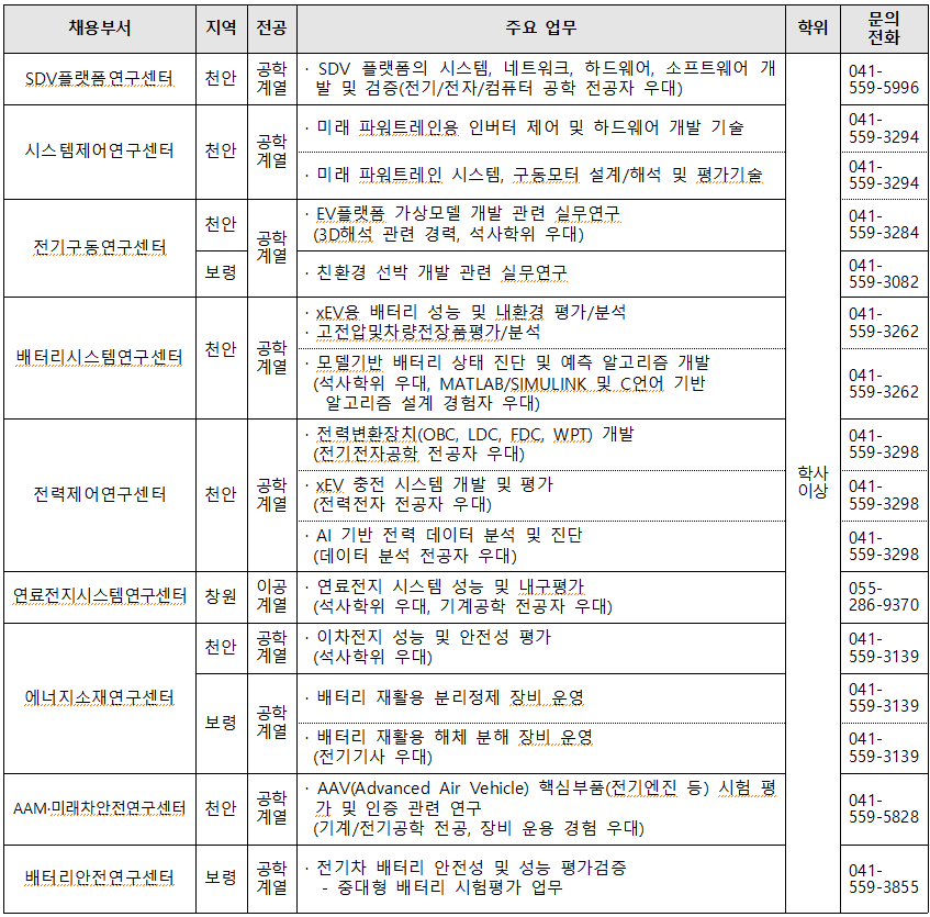 1) 접수마감 : 2025. 11. 5. (수) 12:00 2) 접수방법 : 연구원 홈페이지 인터넷 접수 (katech.recruiter.co.kr) (한국자동차연구원 인재경영실, ☎ 041–559–3016)