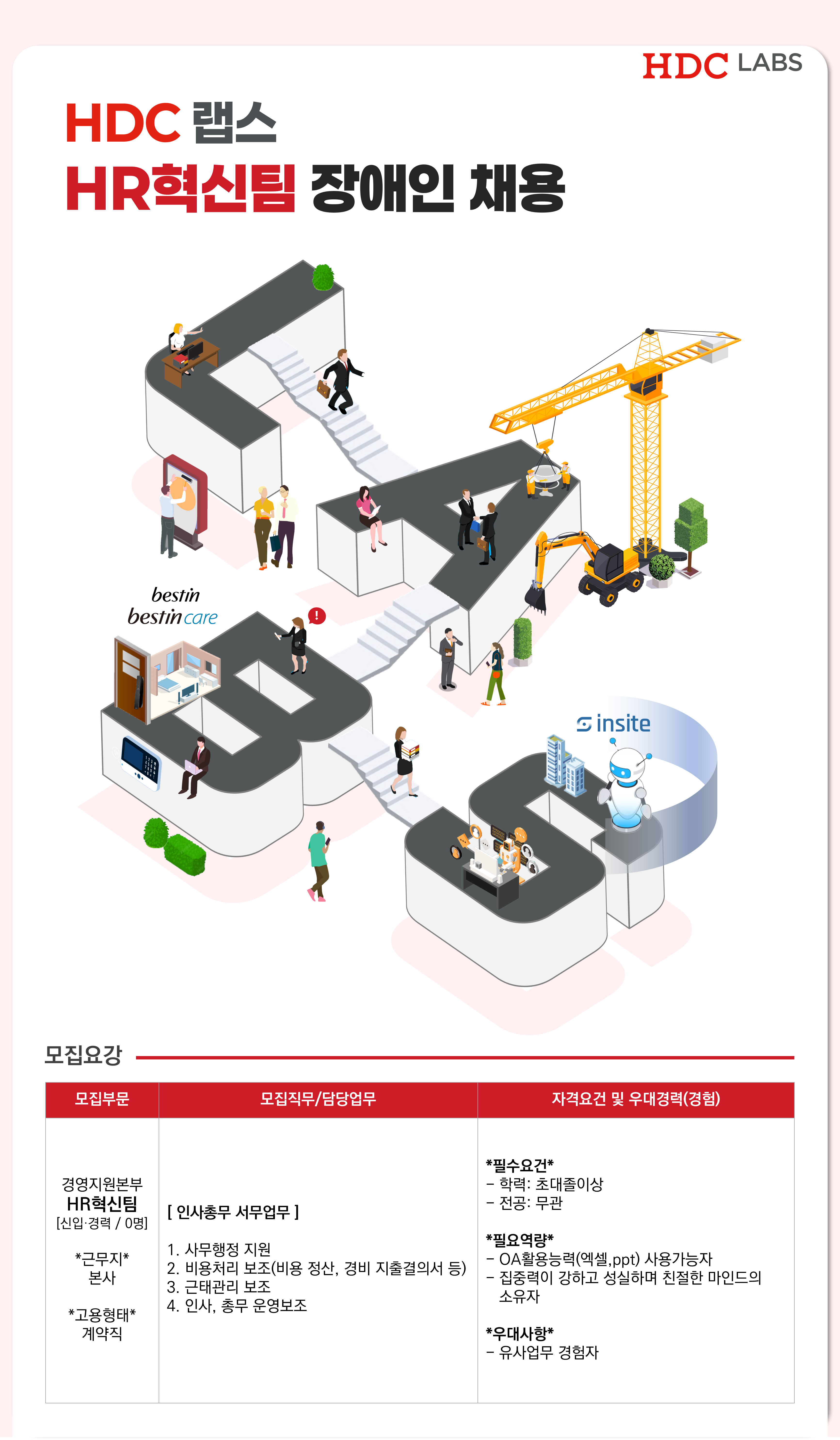 🔹 공고명 :  [HDC랩스/본사] HR혁신팀 인사총무 서무직무 장애인 채용 **(바로가기 링크: HDC랩스 채용 | [HDC랩스/본사] HR혁신팀 인사총무 서무직무 장애인 채용) 🔹 모집분야 : 인사총무 서무직무