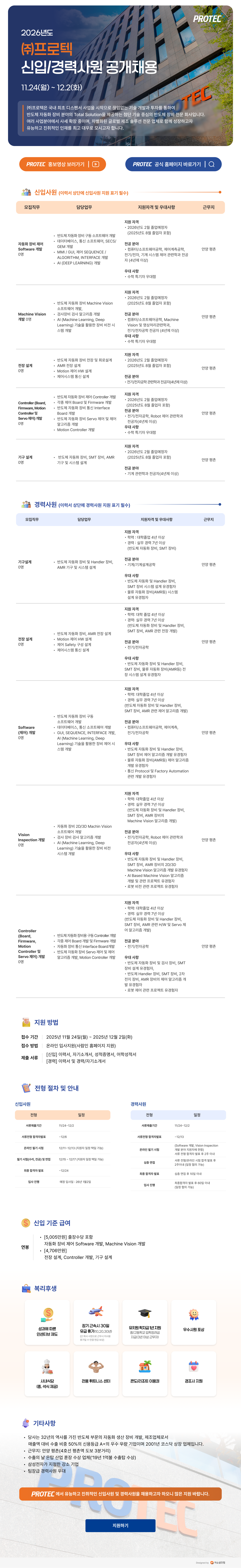 지원 자격 - 신입 : 2026년도 2월 졸업예정자 (2025년도 8월 졸업자 포함) ※ 각 모집 직무별 상세 지원 자격은 공고문 확인 부탁드립니다. 접수 방법 채용사이트 접수 : https://www.saramin.co.kr/zf_user/jobs/relay/view?rec_idx=52367925&view_type=list 접수 기간 2025년 11월 24일 - 2025년 12월 2일 23:59