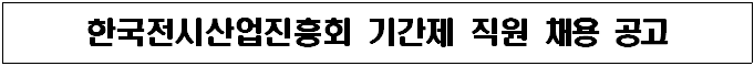 사단법인 한국전시산업진흥회는 국내전시산업 육성ㆍ지원과 국제화를 위한 각종 정책 건의 및 사업 수행을 위해 설립된 산업통상자원부 산하기관으로, 본 회 국가인적자원개발컨소시엄사업 및 행정지원을 담당할 유능한 직원을 다음과 같이 모집하오니 관심 있는 여러분의 많은 지원 바랍니다. - 다 음 -