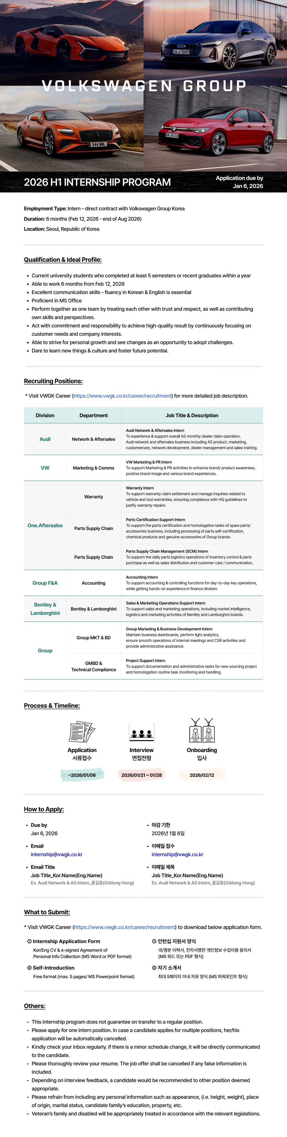 EX. Audi Network & AS Intern_홍길동(GilDong Hong) ■ What to Submit *Visit VWGK Career (https://www.vwgk.co.kr/career/recruitment) to download below application form. 1. 인턴십 지원서 양식 국/영문 이력서, 전자서명한 개인정보 수집이용 동의서(MS 워드 또는 PDF 형식) 2. 자기 소개서 최대 5페이지 이내 자유 양식(MS 파워포인트 형식) ■ Process & Timeline Application(~26.01.06) → Interview(26.01.21 ~ 01.28) → Onboarding(26.02.12) * 자세한 내용은 반드시 아래 URL을 통해서 확인 부탁드립니다. 지금 폭스바겐그룹코리아와 함께 하세요. ![]() |
