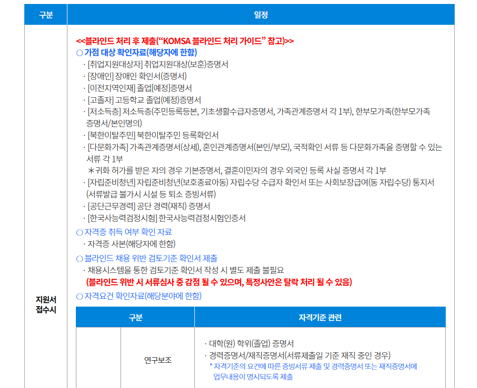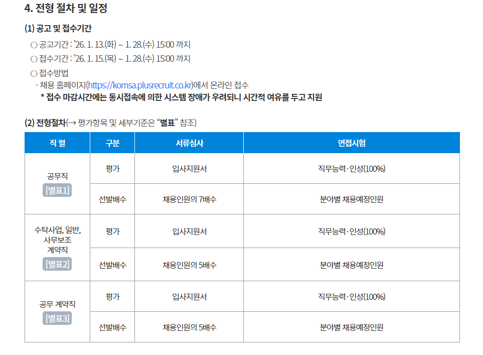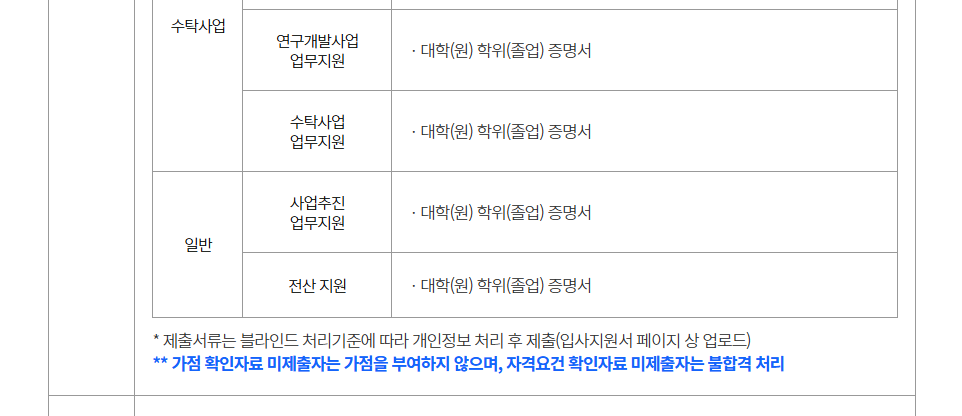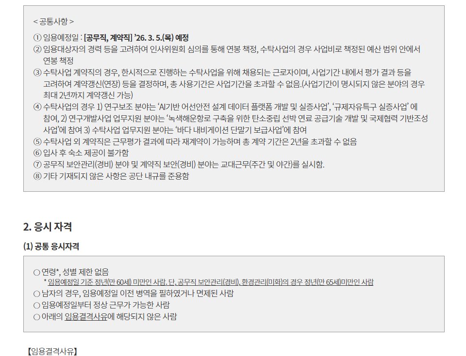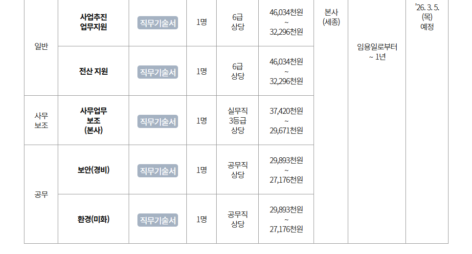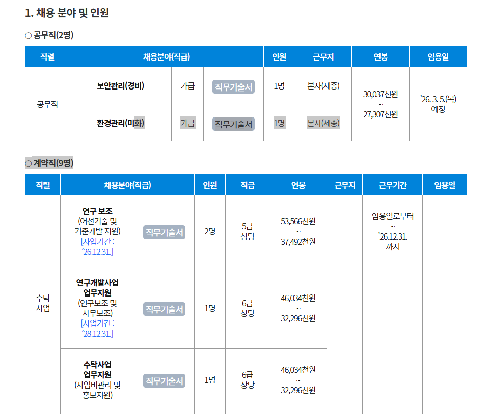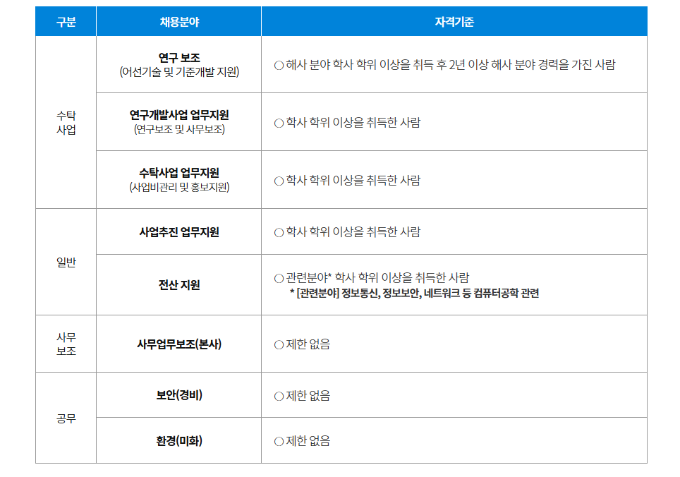 공무직(보안관리, 환경관리), 계약직(연구보조, 연구개발사업지원, 수탁사업지원, 사업추진지원, 전산, 업무보조, 보안, 환경)