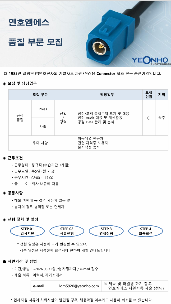 [(주)연호엠에스] 품질부문 신입/경력 채용