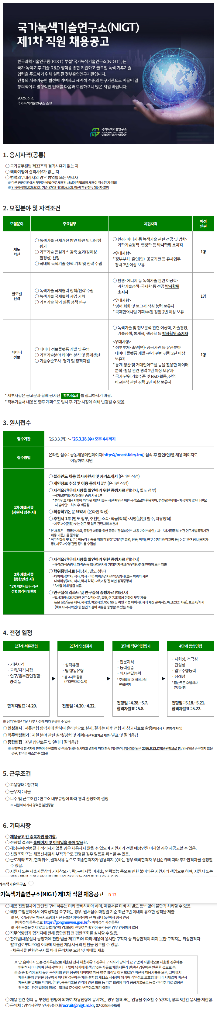 국가녹색기술연구소(NIGT) 제1차 직원 채용공고(~3/18)