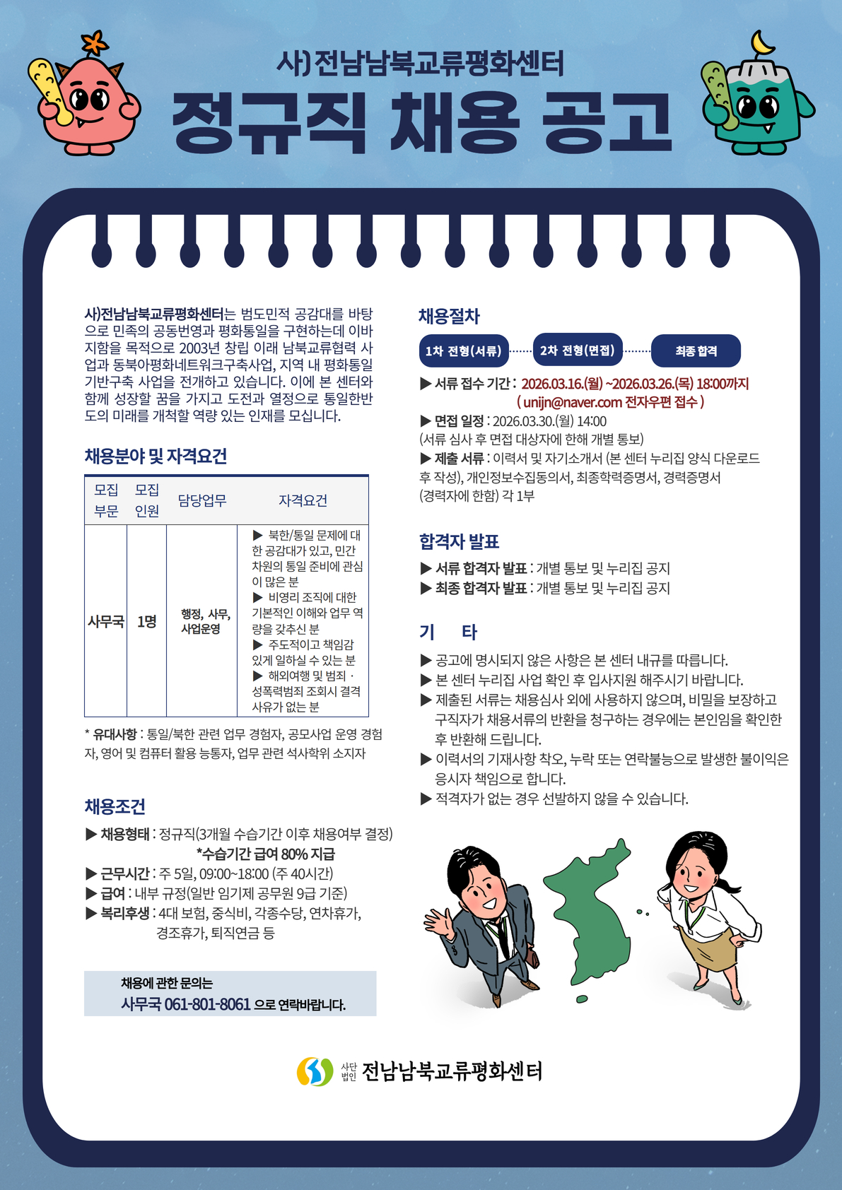 1. 채용인원: 사무국 활동가 1명(신입/경력 무관) 2. 담당업무: 사업 기획 및 운영, 행정 사무 보조 등 3. 접수기간: 2026.03.16.(월) ~ 2026.03.26.(목) 18:00까지 4. 접수방법: 전자우편 접수(unijn@naver.com) 5. 문의사항: 사)전남남북교류평화센터 사무국(T.061-801-8061) |